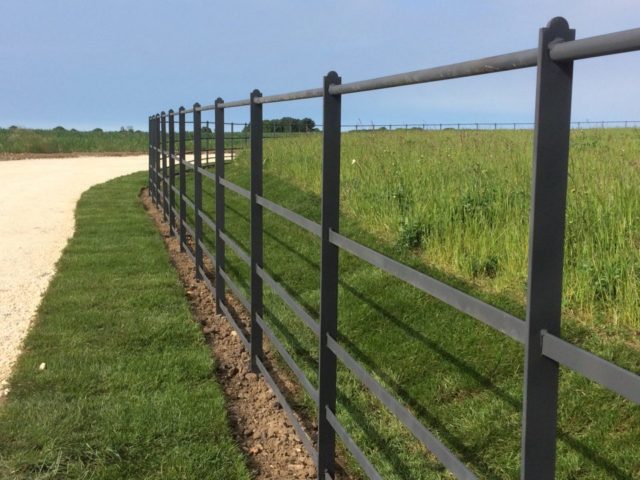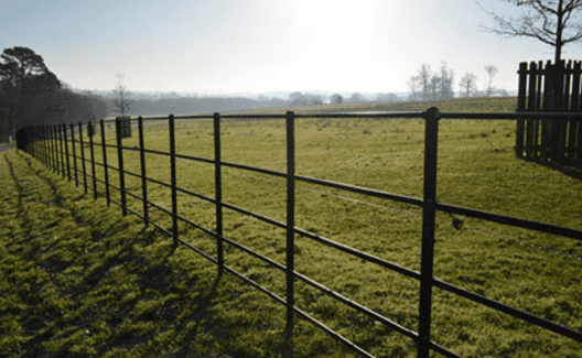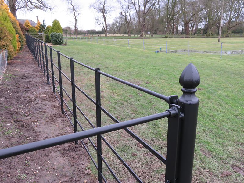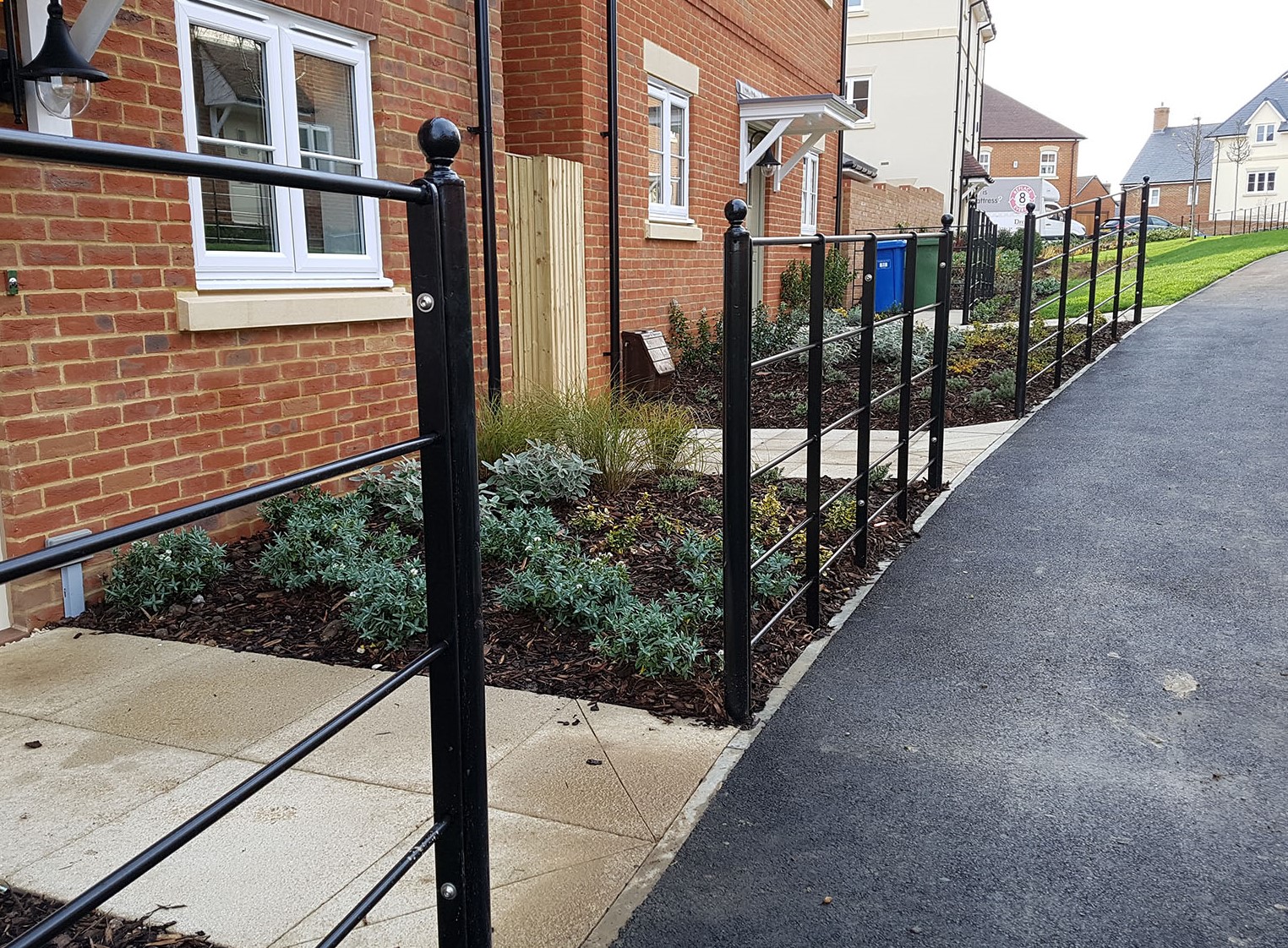 Prima Estate Railings we once the primary fencing used on large country estates. However many housebuilders are using estate railings on developments to give that country feel. Previously the specification had flat bar infills that would pass through the posts and either be welded or tacted on site. Nowadays estate railings come in 2m sections and bolt to posts. The 1.2m height is generally the same but there are various specifications with differing numbers of horizontal rails and post options.