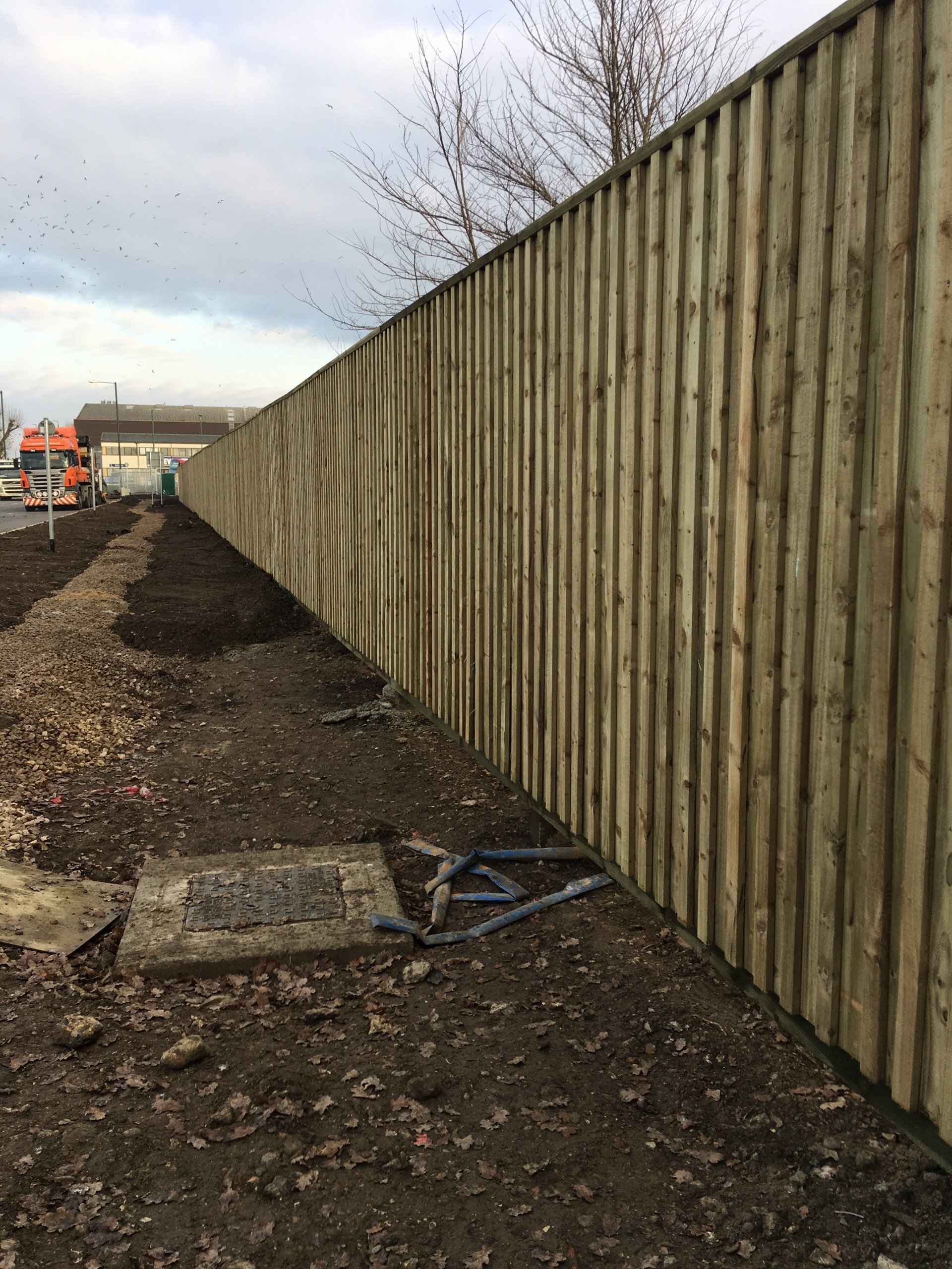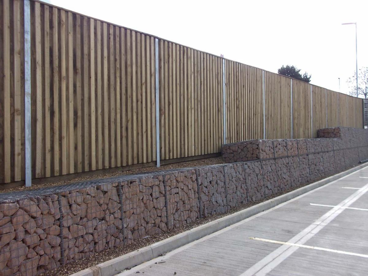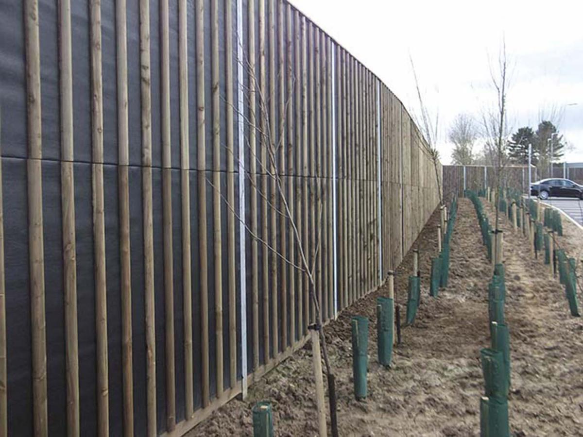 Absorbent timber fences usually have a double-sided quality, one side has timber vertical boards with cover strips and the other side has a geotex protective membrane and rockwool to absorb unwanted noise. Absorbent acoustic fencing will have a test rating of up to 32 dB* in noise reduction and conform to BS EN 1793-2 Category  A3